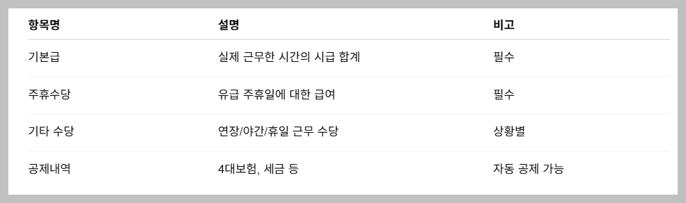 만약 ‘주휴수당’ 항목이 빠져 있다면, 사업주에게 반드시 확인 요청을 해야 합니다.