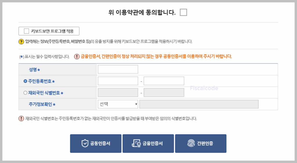 정부24와 마찬가지로 본인 인증이 필요합니다. 공동인증서 또는 모바일 간편 인증 등을 통해 인증을 진행하면 됩니다.