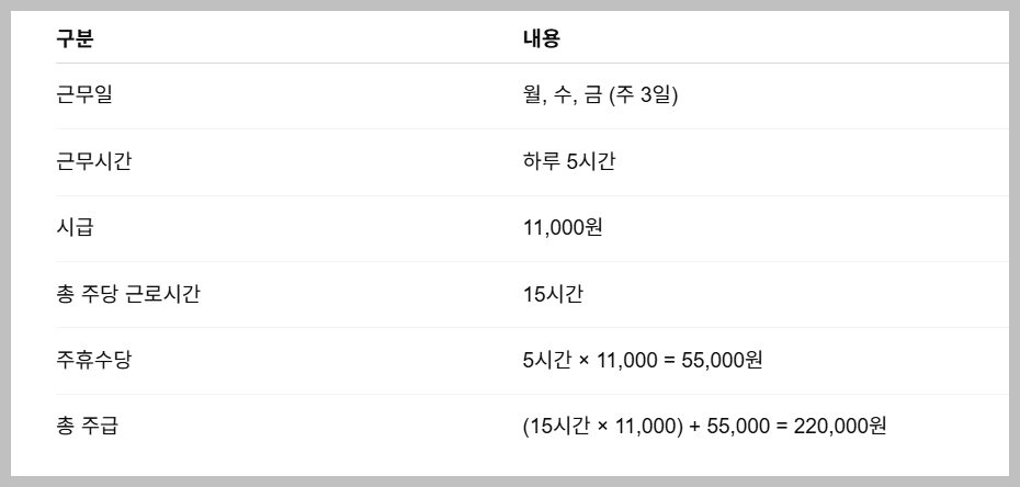 주휴수당 = 5시간 × 11,000원 = 55,000원